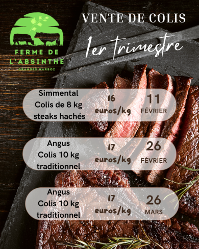 Les colis de viande hachés (8 kg) sont proposés 2 fois dans l'année : 2/3 steaks hachés, 1/3 viande hachée, 1 côte.